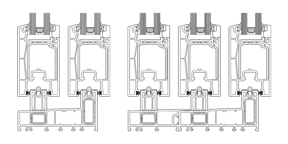 En sistemas fijo-móvil, el umbral no posee guía de marco en la hoja activa, quedando el marco sin obstrucciones del lado exterior. Además, con refuerzos de mayor inercia, que garantizan una óptima funcionalidad y prestación, ofrece la posibilidad de incluir mosquiteros de PVC.